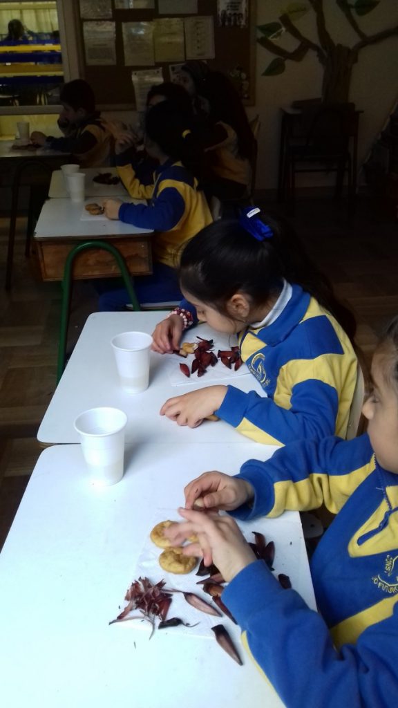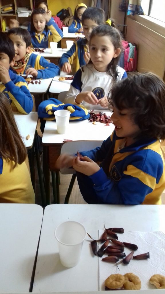 En esta oportunidad los alumnos reflexionaron en torno a la influecia de los pueblos originarios en la formación de nuestra identidad nacional, valorando estos aportes y compartieron algunos alimentos típicos como piñones oyiwiñ kofke (sopaipillas).