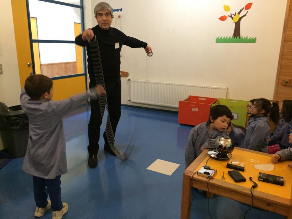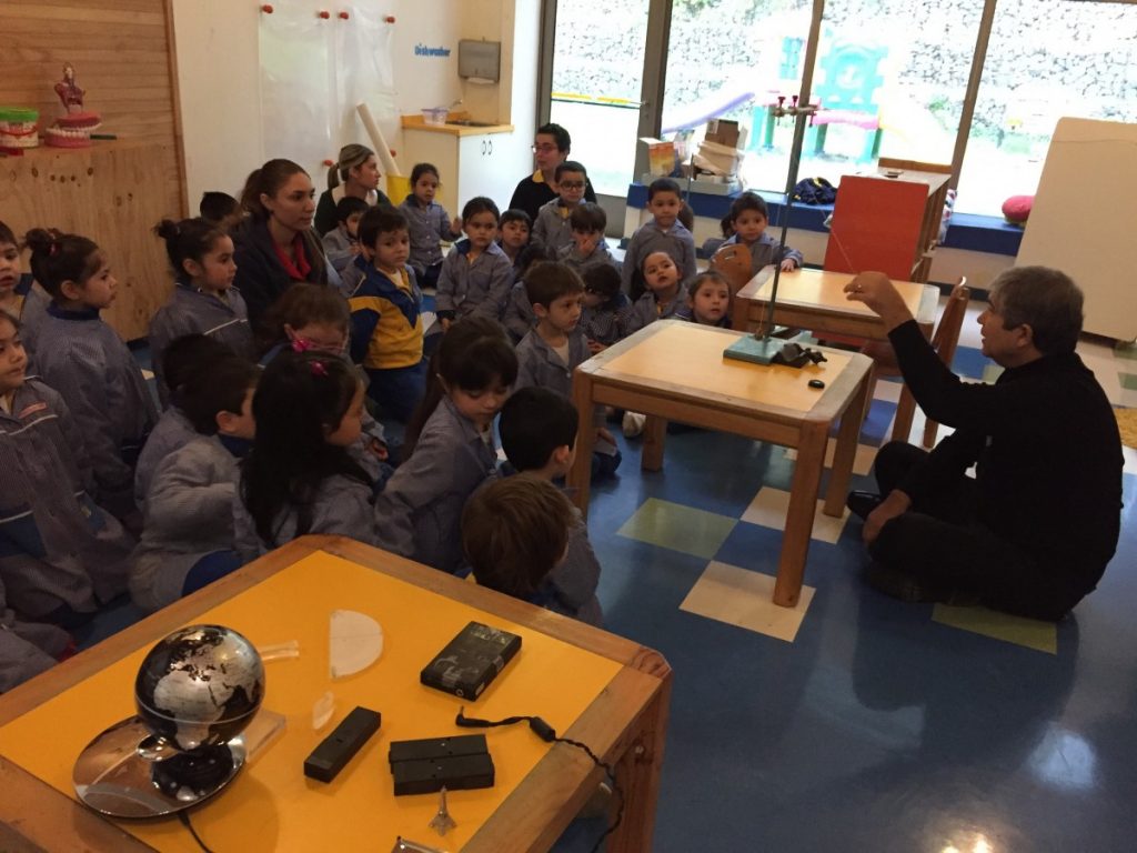 En esta instancia, los niños y niñas del nivel, observaron de manos del Rector, la presentación de diversos experimentos de física que fueron desarrollados por medio de experiencias de aprendizaje concretas. Incorporándose conceptos básicos de la física tales como: Levitación magnética, oscilación de ondas y transmisión de luz por medio de fibra óptica y prismas.