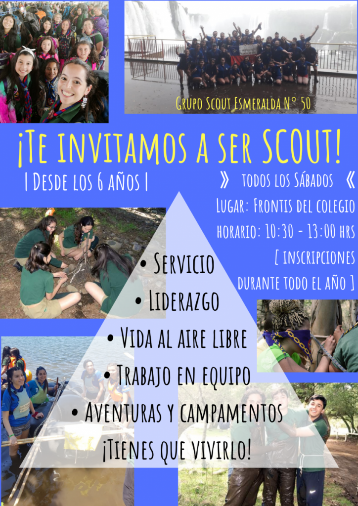 Si quieres vivir nuevas aventuras, te gusta la naturaleza, la vida al aire libre, acampar, compartir, entre otras cosas…ven y únete a nuestro Grupo Scout. Todos los sábado de 10:30 a 13:00 hrs. en el frontis del Colegio Concepción Pedro de Valdivia.