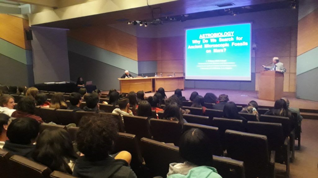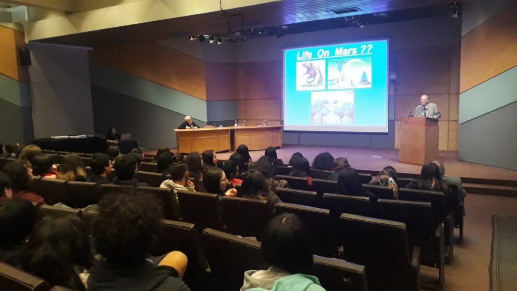 En el marco de los 100 años de la Universidad de Concepción y con el fin de acercar la ciencia de alto nivel internacional a la comunidad escolar de enseñanza media en nuestra región, la Facultad de Ciencias Naturales y Oceanográficas en conjunto con el Departamento de Oceanografía, realizo una invitación a los alumnos del Tercero Medio Biológico a participar el día 02 de septiembre de las Conferencias Científicas Centenario: “El Sulfureto de Humboldt: su potencial aporte al estudio del origen de la vida en la tierra”, con dos Charlas Magistrales: a) “Why do we search for microscopic fossils on Mars?” (¿Por qué buscamos fósiles microscópicos en Marte?) Dictada por el destacado científico y académico de la Universidad de California, Los Ángeles (UCLA), L.A.,U.S.A. y miembro de la Academia Nacional de Ciencias de Estados Unidos de América, Prof. Dr. J. William Schopf. y, b) “El Sulfureto de Humboldt: un vergel de microbios precámbricos y un desafío de investigación para la juventud”. Dictada por el destacado científico chileno de la Universidad de Concepción, Prof. Dr. Víctor Ariel Gallardo.