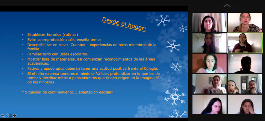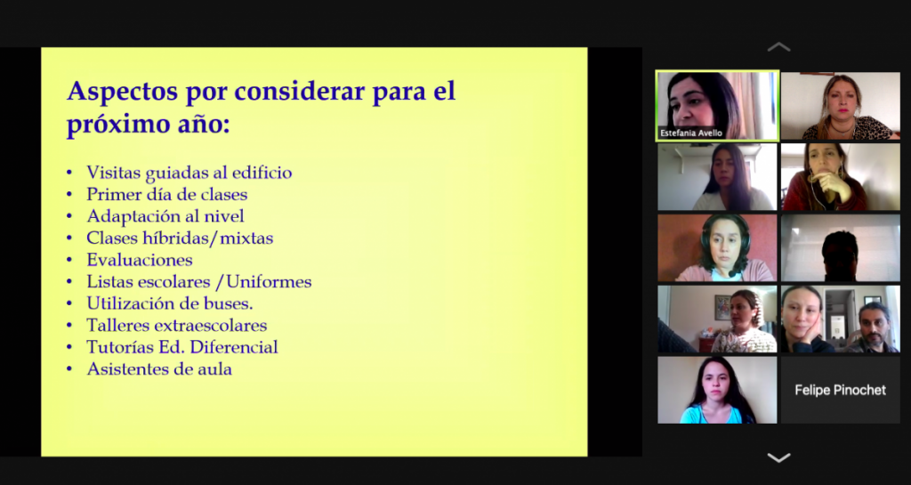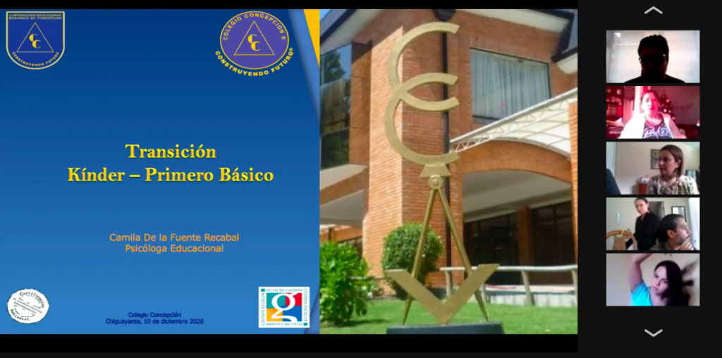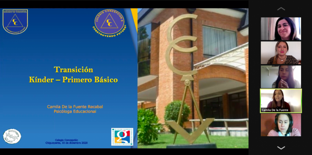 El jueves 10 de diciembre se realizó una nueva actividad que se suma a las anteriores: vídeos de las nuevas dependencias que los esperan en primer año básico, visita de las profesoras de primer año de ciclo básico a los estudiantes de kínder, realización de vídeos de saludos de los funcionarios que los esperan en primero básico, bibliotecaria, enfermera, inspectora de nivel y asistentes de la educación, vídeo del departamento de inglés quien sigue profundizando en la inmersión es este idioma; este día recién mencionado se llevó a cabo la charla para madres, padres y apoderados denominada “Abordaje efectivo de Transición”, la psicóloga educacional Camila De la Fuente abordó la temática desde el punto de vista emocional afectivo. Luego la profesora de educación básica, Estefanía Avello realizó una breve exposición sobre las características propias de Primero Básico.