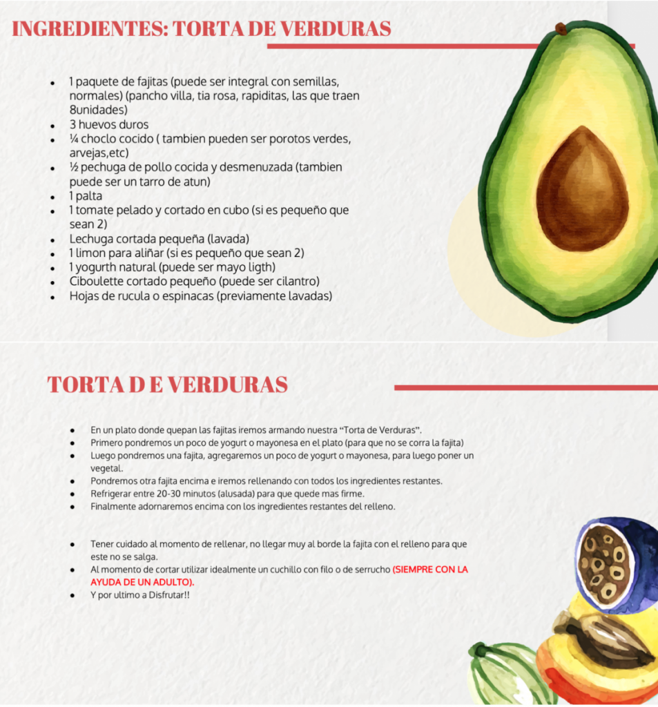 El taller extraescolar de “Cocina entretenida” en donde participan estudiantes de 3º a 6º básico, el cual se realiza todos los días lunes de 15:00 a 16:20 horas vía zoom y es dirigido por la chef Rocio Sanhueza, preparó un recetario de 3 platillos saludables, para que puedan realizarlos en sus casas y así transformarse en unos Máster Chef.