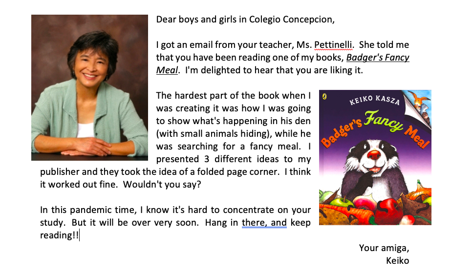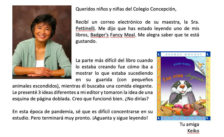 Por otro lado, niños, niñas y familias han podido comunicarse con una destacada exponente que forma parte de la comunidad internacional, como es el caso de la autora del Plan Lector de Kínder 2021, Keiko Kasza. Recibiendo un mensaje relacionado con el cuento: “Una cena elegante” con el que trabajaron durante el primer semestre.