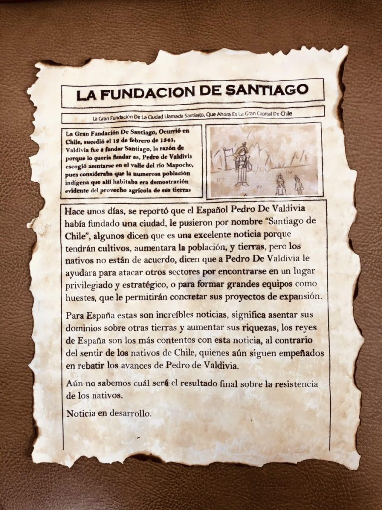 Lo anterior es lo que se hizo en quinto básico, en la continua búsqueda de estrategias didácticas que motiven a los estudiantes y favorezcan sus aprendizajes, se integró temas de Historia con Lenguaje, logrando que niños y niñas demostraran su manejo de hitos históricos de la época de la conquista al redactarlos en formato de texto noticioso.