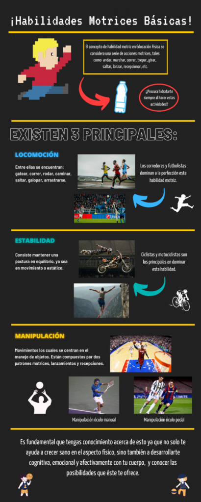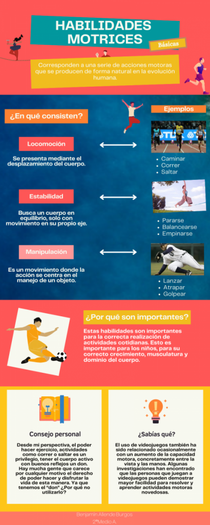 El Departamento de Educación Física y Salud dispuso de información pertinente al nivel y los contenidos que los niños de 3° y 4° año básico conocen respecto de las Habilidades Motrices Básicas, fundamentales para la ejecución de todas nuestras actividades diarias. Mientras que los alumnos de 2° año medio en la asignatura de Lengua y Literatura se encargaron de elaborar infografías atractivas que les permitan incorporar aquellos conocimientos. Sumado a ello, los estudiantes del nivel medio anexaron consejos útiles para la futura vida adolescente de aquellos.