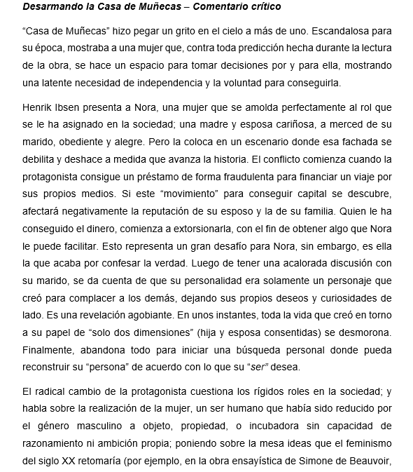 Casa de muñecas es una obra dramática escrita por Henrik Ibsen cuyo estreno, a fines de 1879, generó amplio revuelo social debido a los tópicos abordados: normas conyugales, rol de la mujer, engaños e injusticias sociales, principalmente.