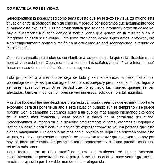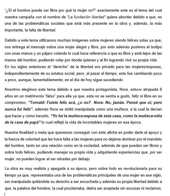 Los estudiantes de segundo medio A y B crearon, en la asignatura de Lengua y Literatura, interesantes campañas propagandísticas a partir de las temáticas que se abordan en la reconocida obra Casa de Muñecas.