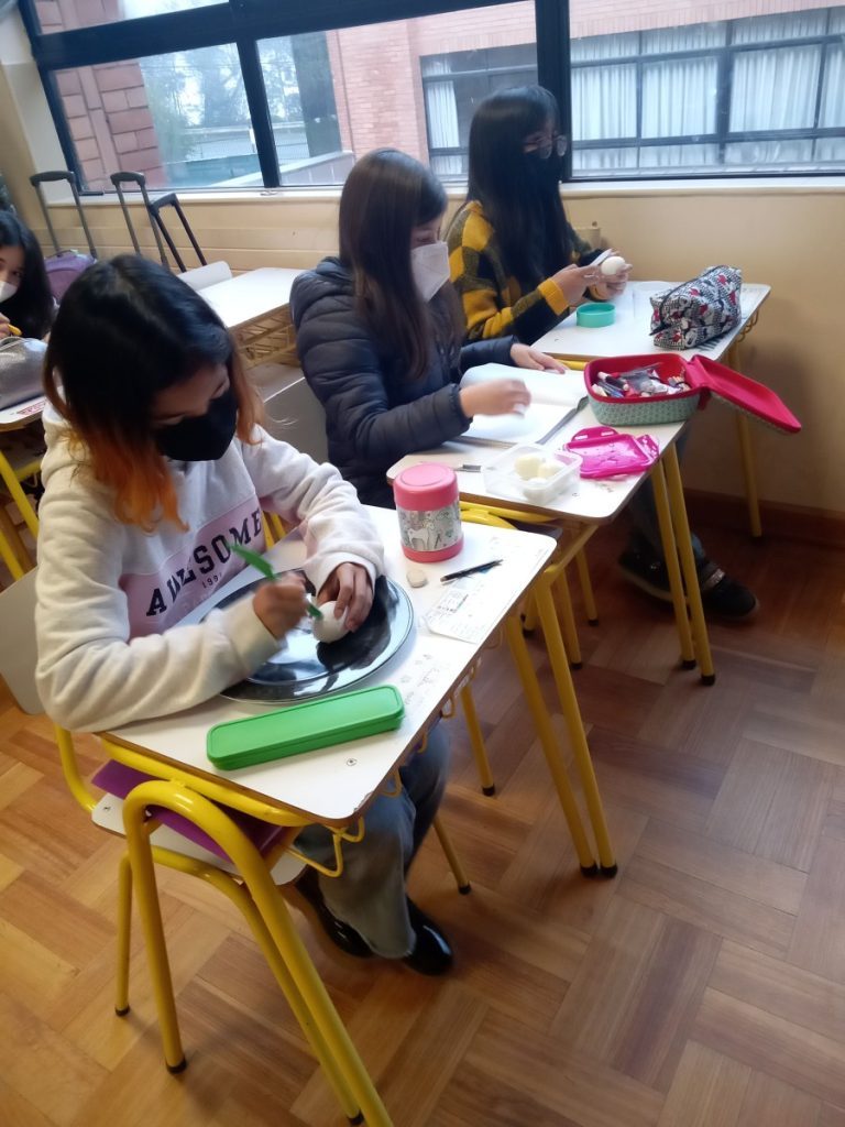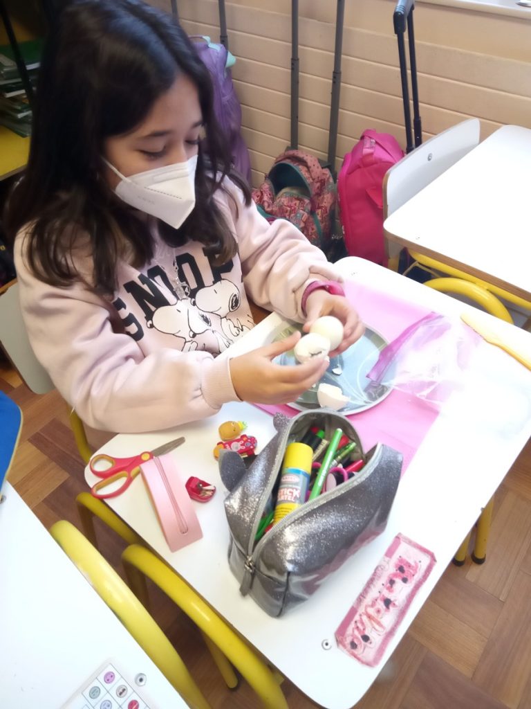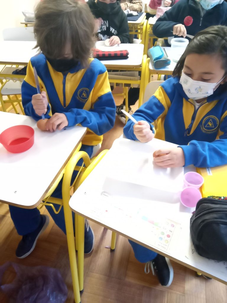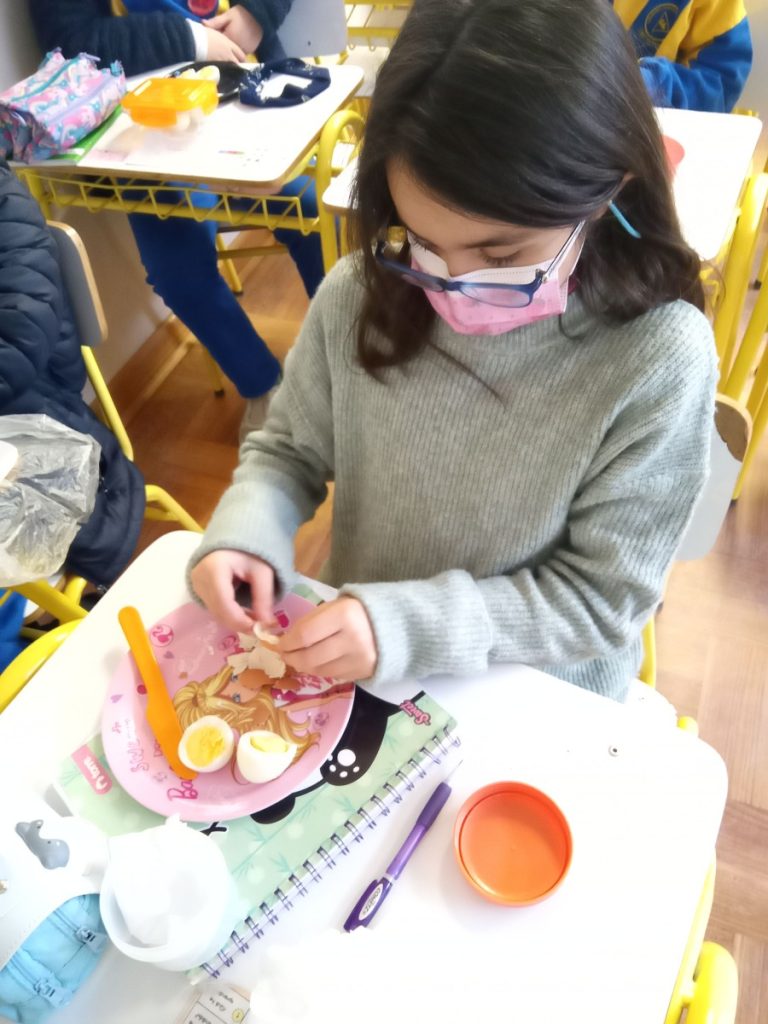 Los alumnos de 4° básico B realizaron un procedimiento, utilizando un huevo duro, que simulaba las capas de la Tierra. Al trizar la cáscara del huevo, pudieron representar la corteza terrestre, que no es continua sino que está fragmentada y que cada una de estas secciones de la corteza de le denomina placas tectónicas.