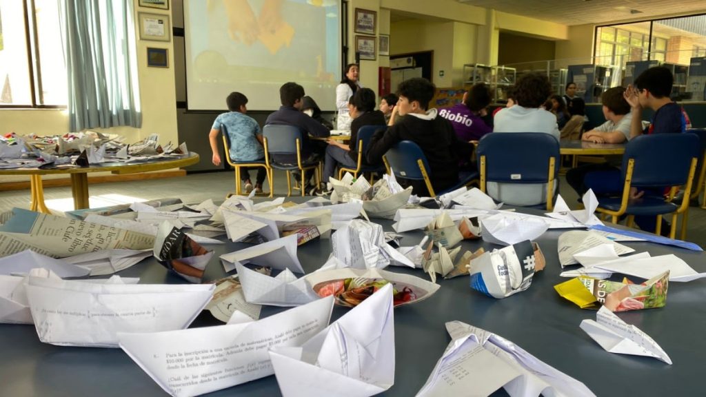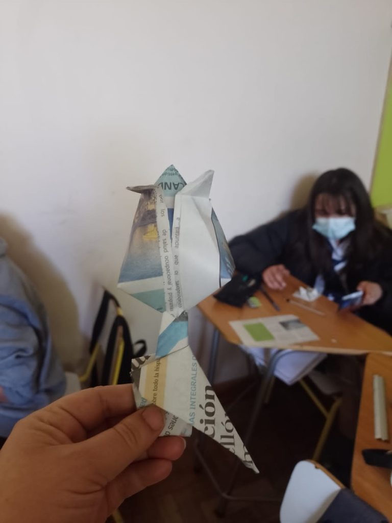 Durante el mes de noviembre los niveles de séptimo y octavo básico de nuestro colegio, en la asignatura de taller de geometría realizaron un taller de origami con material de reciclaje: hojas de guía, evaluaciones, papel de diario y revista. El trabajo con esta técnica facilitó el desarrollo de competencias ciudadanas, al permitirles a los estudiantes trabajar en equipo de forma respetuosa, colaborativa y en armonía con el medio ambiente. Así mismo, les permitió el desarrollo de estrategias metacognitivas necesarias para seguir cada paso en el orden de los acoplamientos correctos necesario para el armado de la figura.