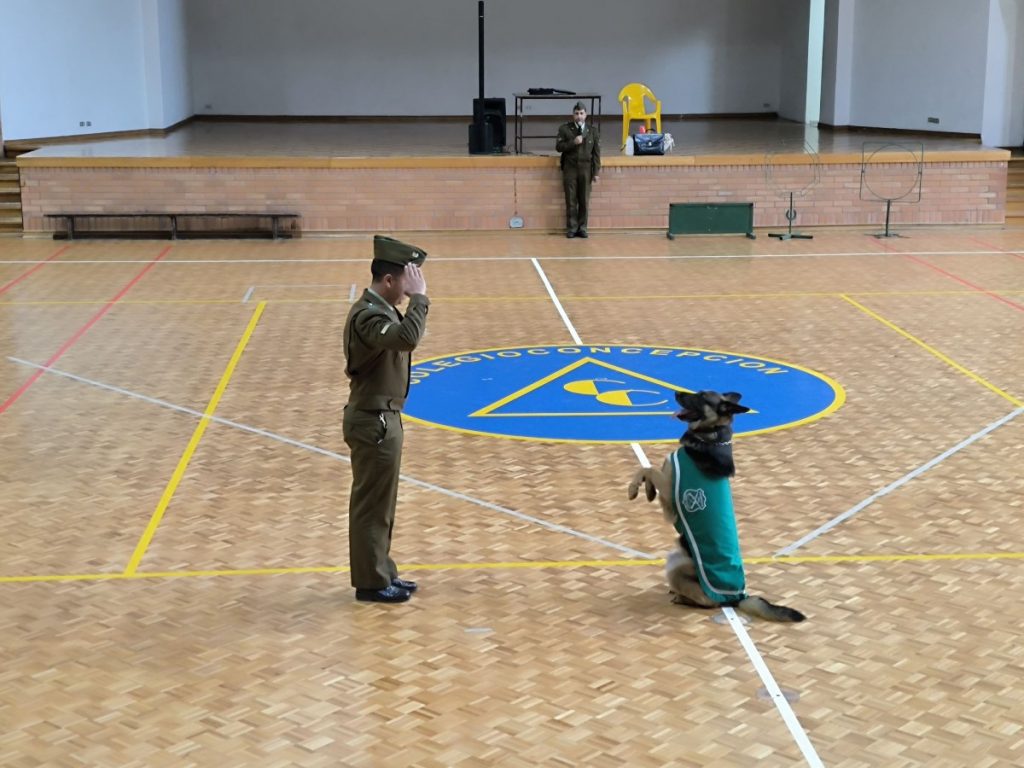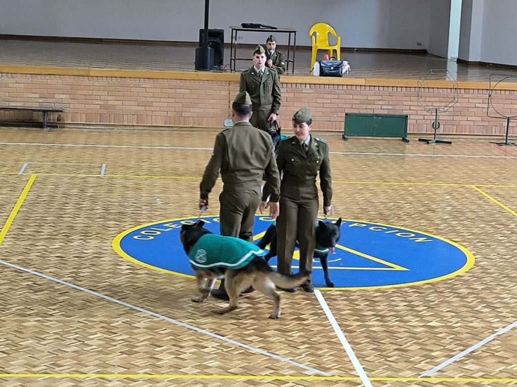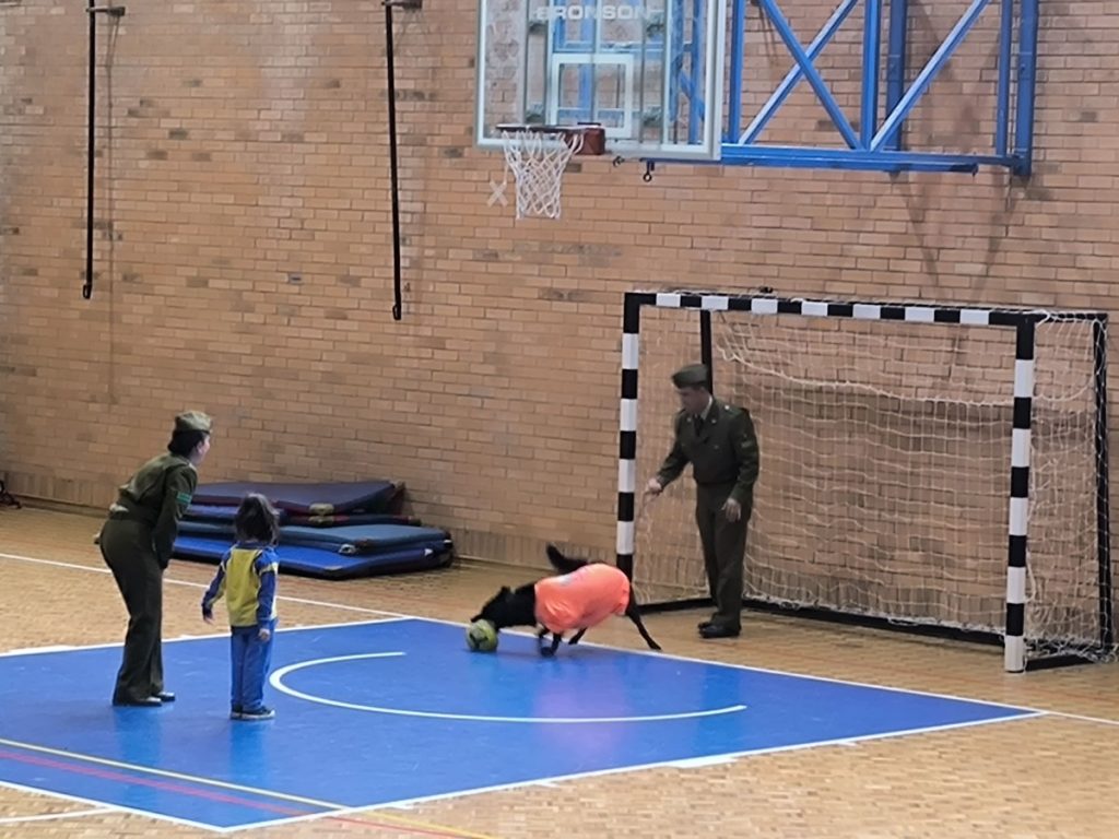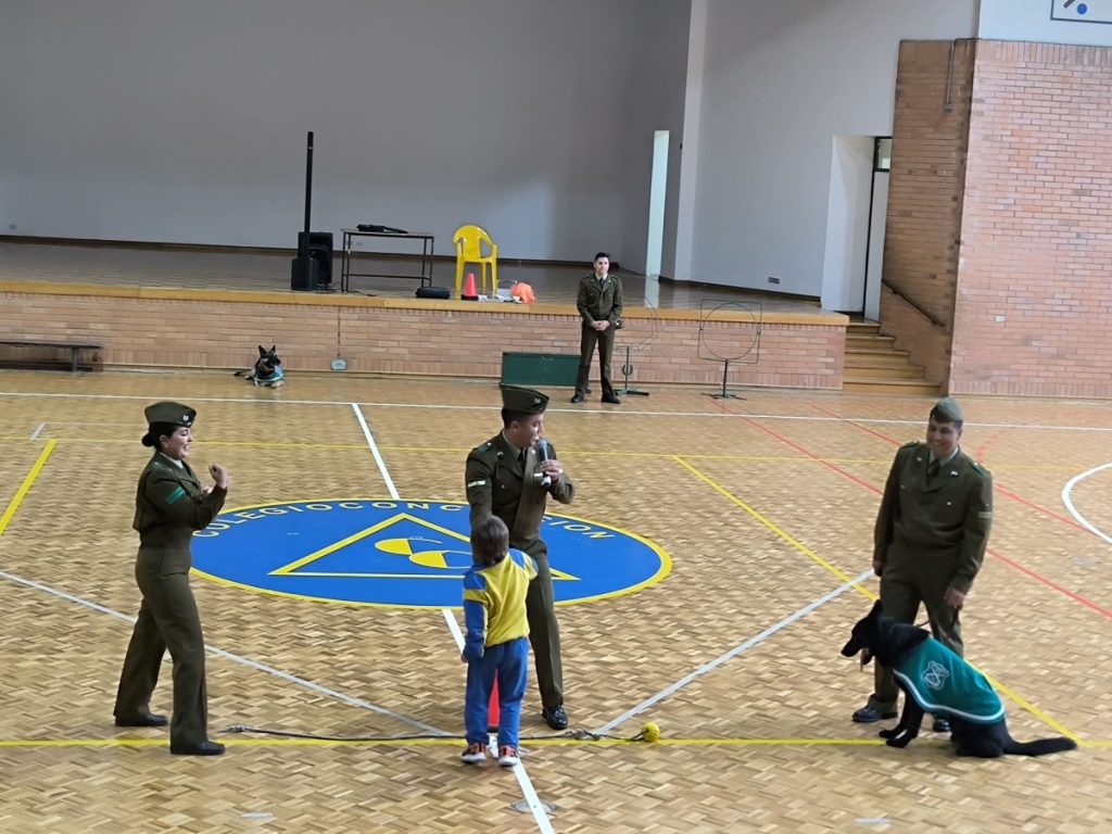 La actividad se realizó en el Gimnasio A de nuestro Colegio, en el lugar los(as) alumnos(as) pudieron apreciar las distintas acrobacias, instrucciones y juegos realizados por el Personal de Carabineros de Chile, Sargento Primero Sr. Claudio Maureira Sáez, Sargento Segundo Sr. José Aravena Espinosa, Cabo Primero Srta. Gisella Rosales Rosales y Cabo Primero Sr. Robert Catril Buriles y los perros a su cargo Dixi, Cody y Elda.