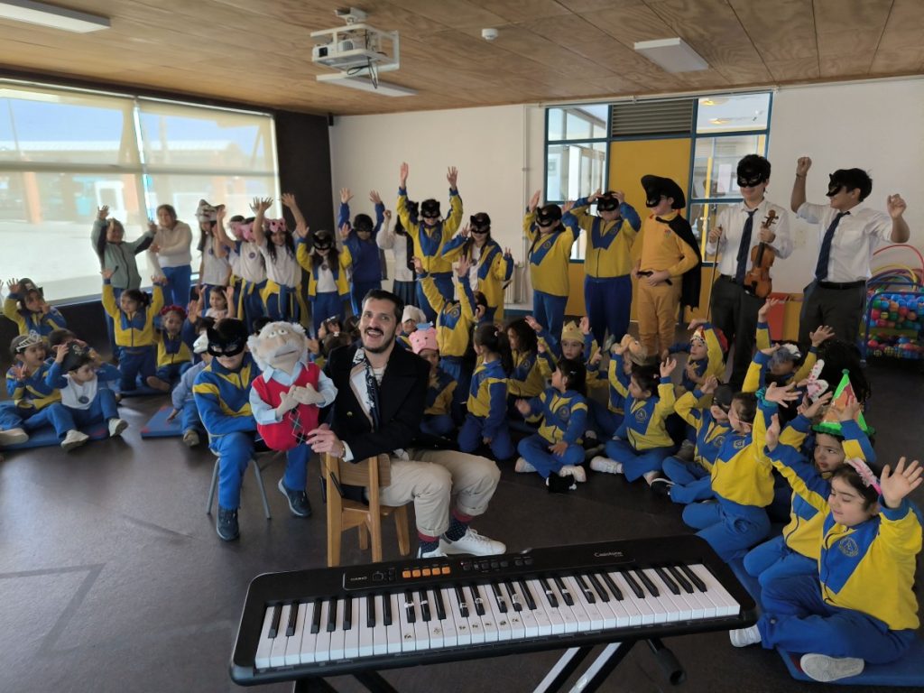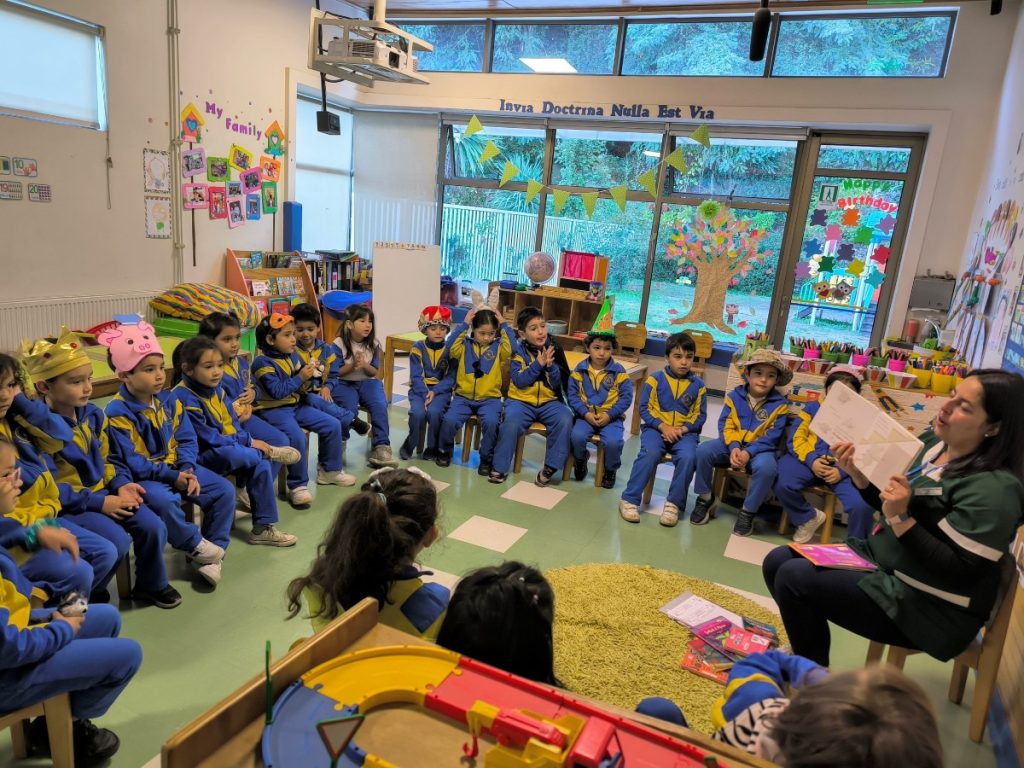 En esta misma línea, se desarrolló un Cuentacuentos musical en Inglés, a cargo del Profesor encargado de Inmersión en Inglés Sr. Marcos Riveros, quien en conjunto con la Profesora de Música Sra. Verónica Cofré y alumnos del taller extra programático de coro, presentaron en Sala de Motricidad del Edificio Parvulario a nuestros niños y niñas.