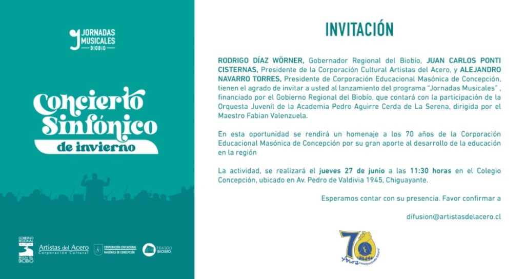 RODRIGO DÍAZ WÓRNER, Gobernador Regional del Biobío, JUAN CARLOS PONTI CISTERNAS, Presidente de la Corporación Cultural Artistas del Acero, y ALEJANDRO NAVARRO TORRES, Presidente de Corporación Educacional Masónica de Concepción, tienen el agrado de invitar a usted al lanzamiento del programa «Jornadas Musicales”, financiado por el Gobierno Regional del Biobío, que contará con la participación de la