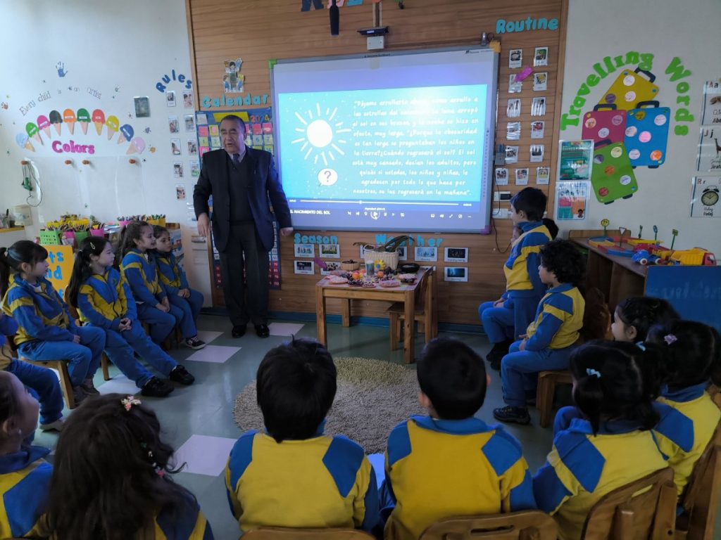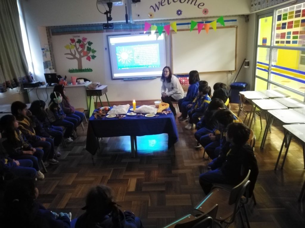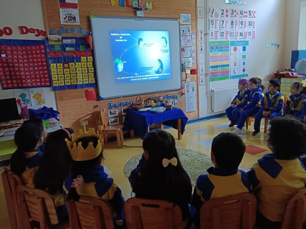 La jornada comenzó con una reflexión educativa sobre el Solsticio de Invierno, donde los niños/as aprendieron sobre el fenómeno astronómico que marca el día más corto y la noche más larga del año. Los profesores y Educadoras utilizaron material audiovisual y un cuento relacionado con dicha actividad llamado “el nacimiento del sol”.