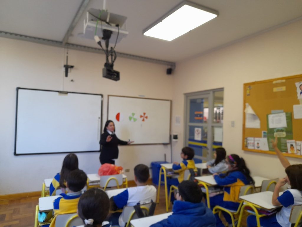 En julio del presente año, la apoderada del 5°A, Sra Paola Rojas Flores, madre de Rafael Miranda Rojas, nos visitó para compartir sus conocimientos como Profesora de Enseñanza Básica . En esta ocasión ella nos compartió diversas actividades y juegos referidos a fracciones y sus equivalencias.