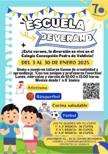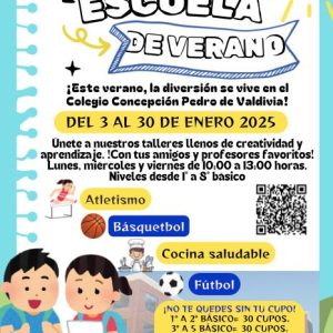 El Centro General de Padres Colegio Concepción invita a todos sus estudiantes desde Primero Básico hasta Octavo año Básico a la escuela de verano que se llevará a cabo en dependencias de nuestro colegio, Avenida Pedro de Valdivia 1945, durante el mes de enero del 2025, será una instancia para practicar deporte, recrearse y vivir una hermosa experiencia con sus compañeros y profesores.