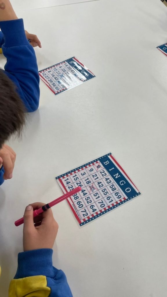 The bingo game was designed to integrate numbers and math problems with the excitement of play. For example, students solved simple math problems, such as 10+11, which corresponded to the numbers on their bingo cards. This creative combination of math and play made learning engaging and interactive.