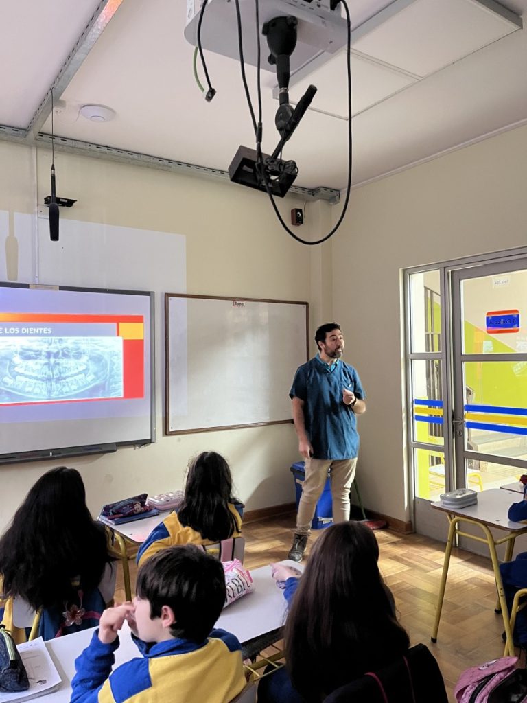 La primera temática abordada fue «La salud dental y su relación con la autoestima», donde un apoderado compartió su experiencia profesional destacando cómo el cuidado de nuestros dientes no solo es importante para la salud física, sino que también influye directamente en cómo nos sentimos con nosotros mismos y cómo nos proyectamos hacia los demás. Los estudiantes participaron activamente con preguntas y reflexiones sobre la importancia de la higiene y el cuidado personal.