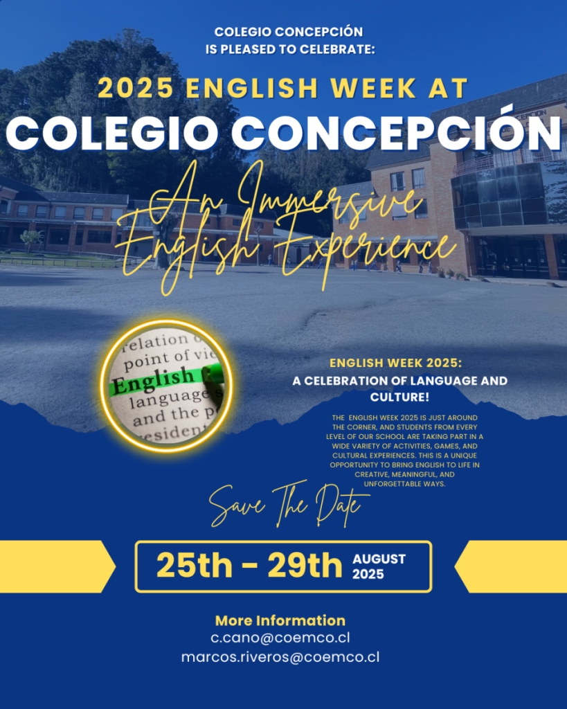 Colegio Concepción is thrilled to announce English Week 2025, a week-long celebration of language, culture, and creativity that will take place from Monday, August 25th to Friday, August 29th. This annual event, organised by the English Department in collaboration with the English Immersion Program, brings together students from across different levels to engage in fun, meaningful, and communicative experiences in English.