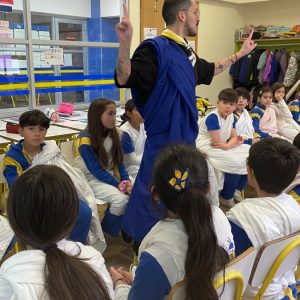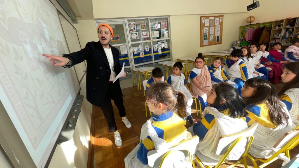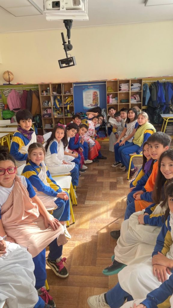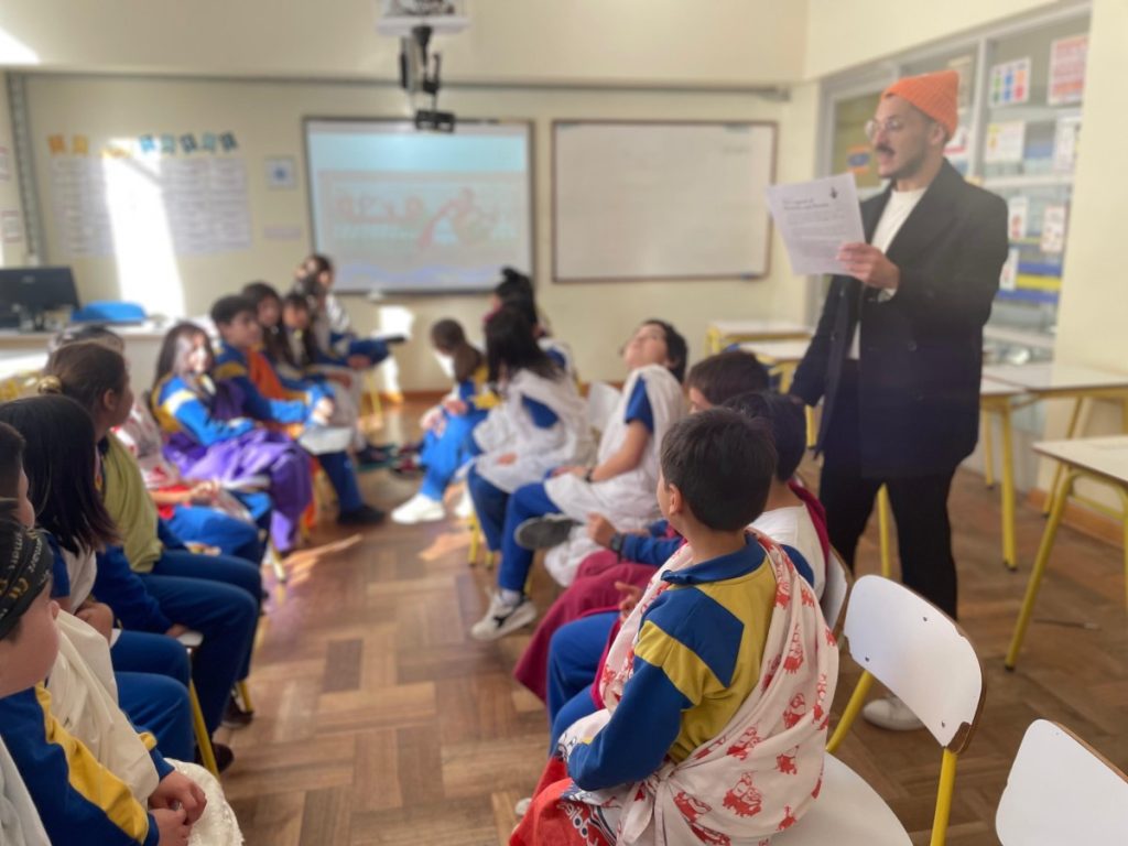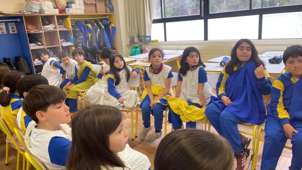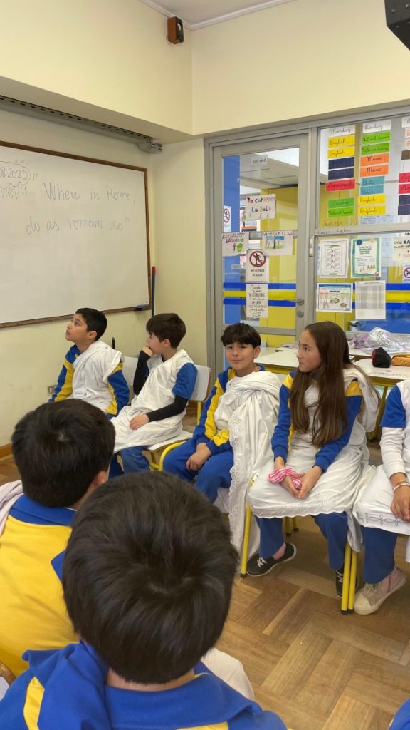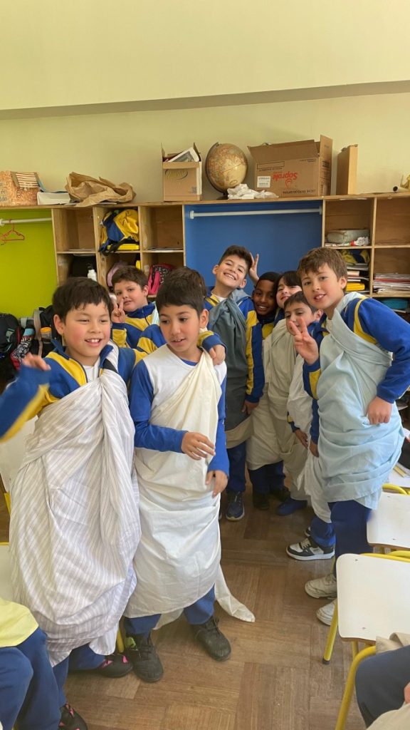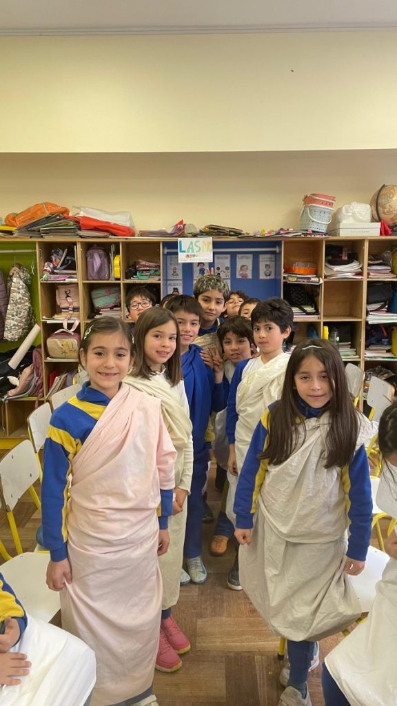 Antes de comenzar la narración, los estudiantes se caracterizaron como romanos, usando sábanas a modo de togas, lo que creó un ambiente lúdico y culturalmente inmersivo. La sala se transformó en un espacio lleno de pequeños romanos preparados para escuchar y representar su historia.