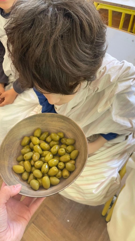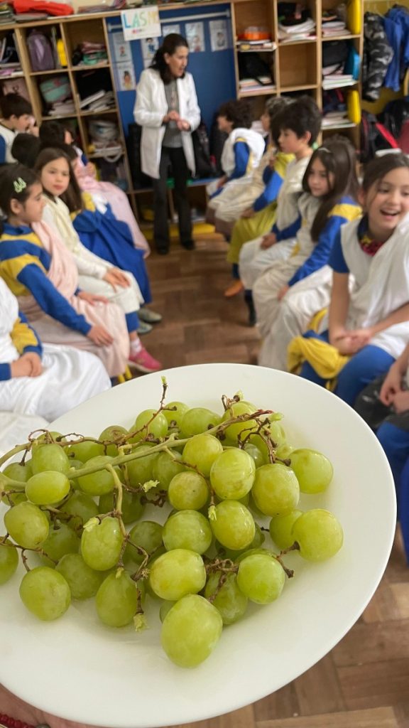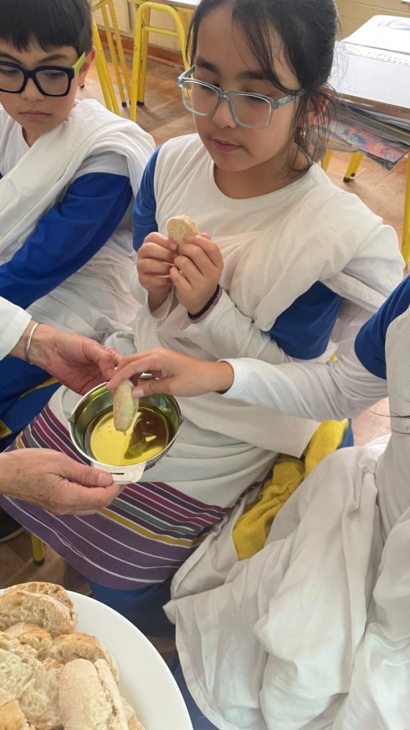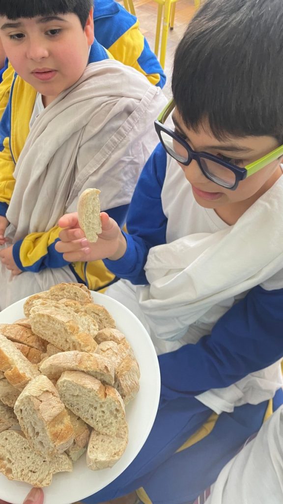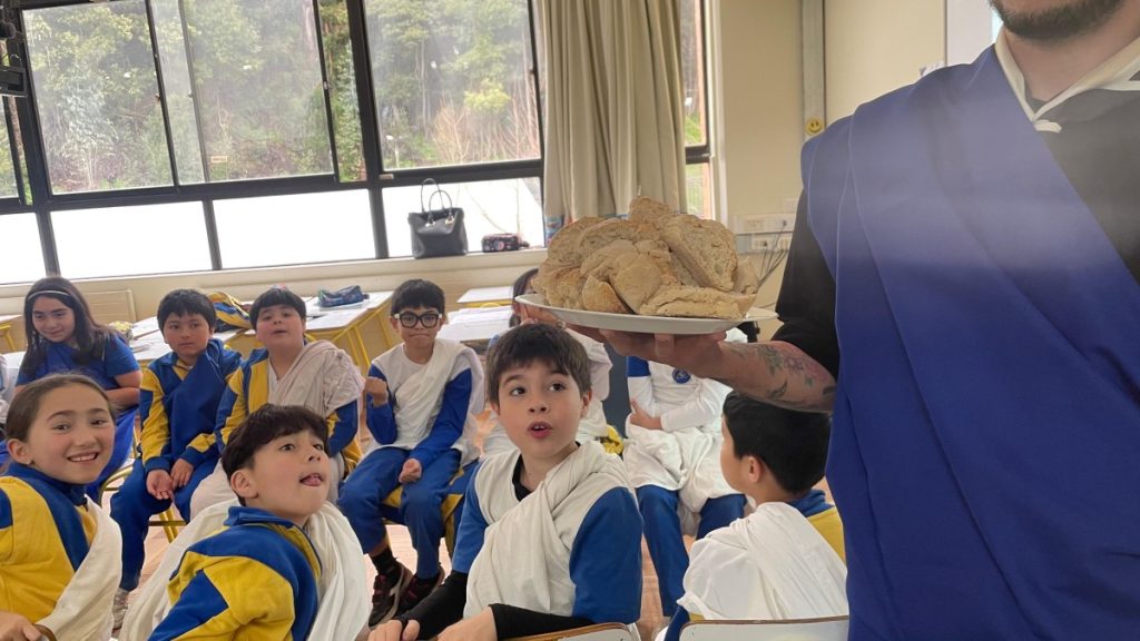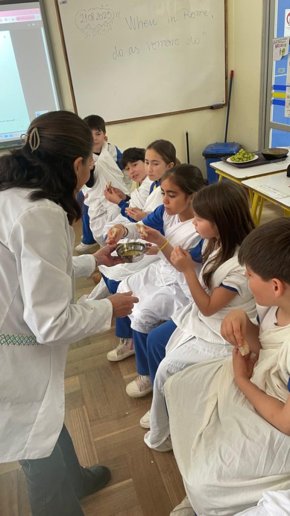 Tras el cuentacuentos, los estudiantes vivieron una experiencia gastronómica inspirada en la Antigua Roma. Se realizó una degustación con algunos de los alimentos más característicos de esa civilización: aceitunas, pan, aceite de oliva y uvas. Fue un momento único en el que los estudiantes, vestidos con sus togas, pudieron “hacer como los romanos”, disfrutando de la historia a través de todos los sentidos.