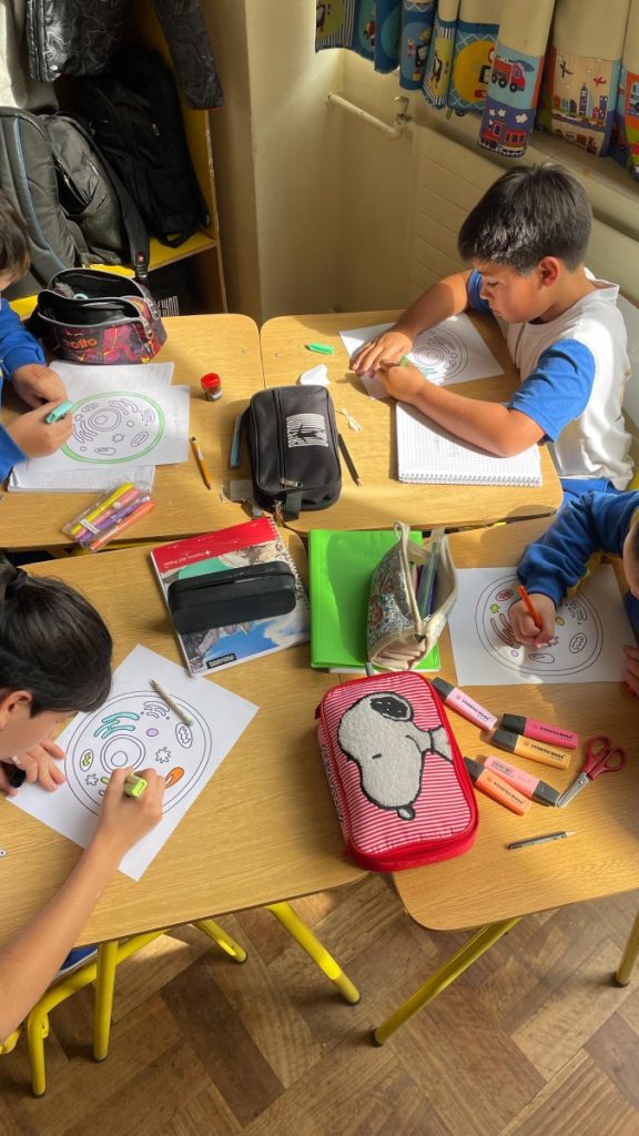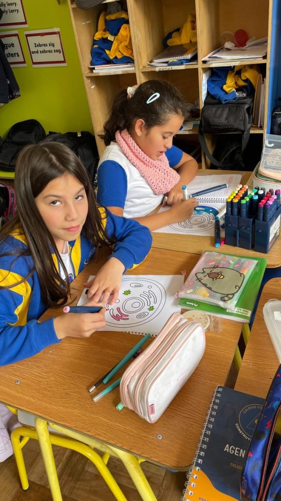 One of the most distinctive aspects of this session was the active participation of Rocío Oyarzúa, student from 2nd grade A, Senior Area, who led the introductory explanation in English. Through her presentation, key concepts such as cells, tissues, and how cells work together were introduced in a clear and engaging way, creating a meaningful connection between students from different levels.