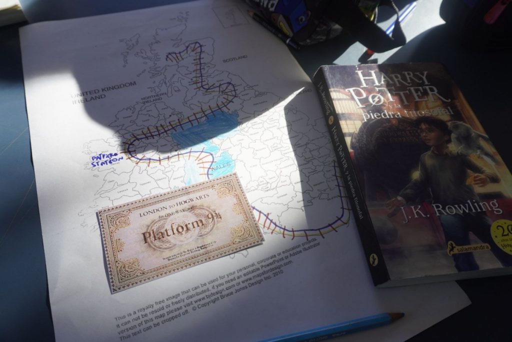 Building on this foundation, students worked with the methodology of Social Mapping, a strategy that promotes the visual and collective construction of knowledge. Using maps of the British Isles, they traced the journey from King’s Cross Station in London to Hogwarts in Scotland, reimagining the route through their own creative lens.